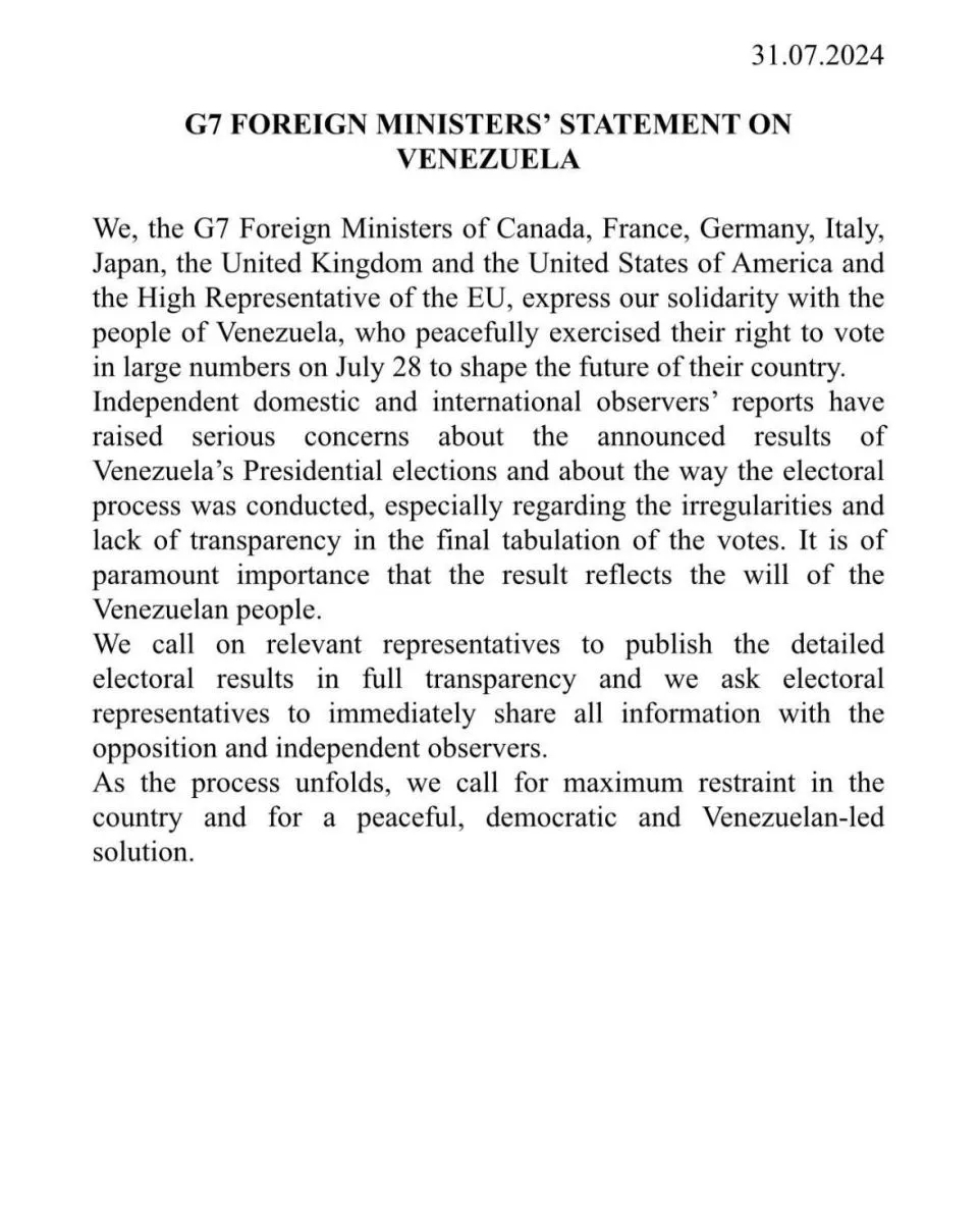 Los ministros de Relaciones Exteriores del G7 (Canadá, Francia, Alemania, Italia, Japón, Reino Unido y Estados Unidos, y el Alto Representante de la UE) hicieron un llamado este miércoles al régimen de Nicolás Maduro para que publique los resultados electorales detallados con total transparencia.