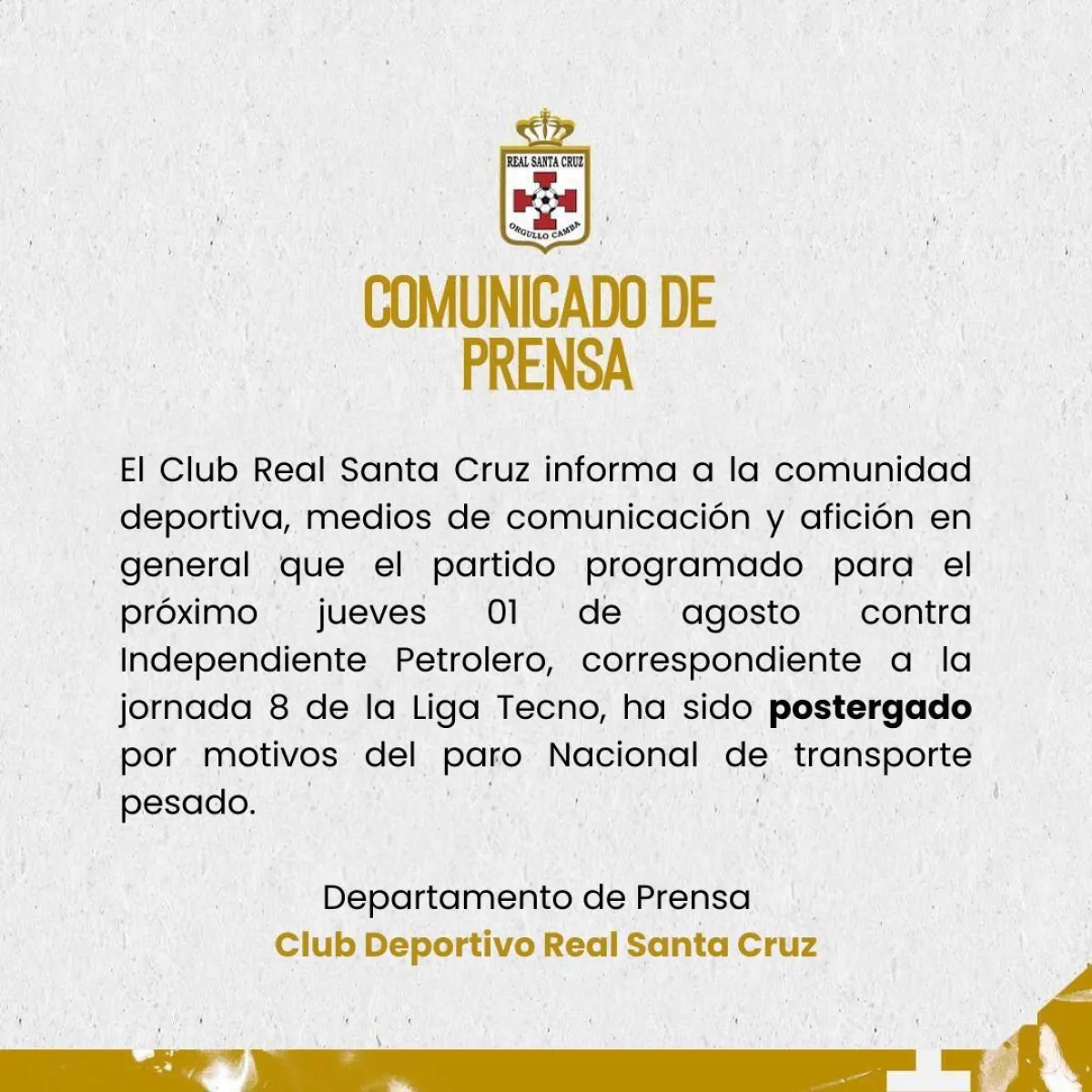 A través de un comunicado de prensa, la dirigencia de Real Santa Cruz ratificó la postergación del encuentro que debían jugar ante el club chuquisaqueño.
