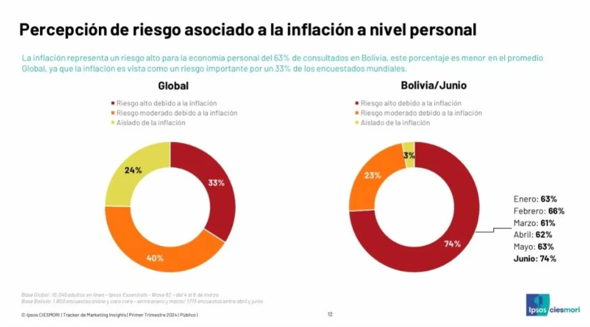 En Bolivia la inflación representa un riesgo alto para la economía personal de los ciudadanos y como mecanismo de protección contra el alza de precios, la gente ha optado por postergar la compra de productos, comparar precios, entre otras medidas, según el estudio Radiografía de la Realidad Boliviana de Ipsos Ciesmori.