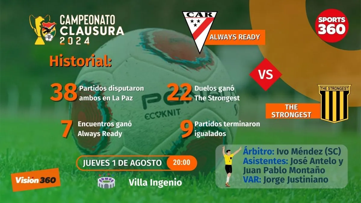 Always Ready y The Strongest jugarán esta noche un atractivo partido por la octava fecha del torneo Clausura (20.00) donde ambos están urgidos de sumar las unidades y rehabilitarse ante sus parcialidades, con los albirrojos con la necesidad de acercarse al puntero mientras los atigrados compartir la cima con Bolívar (17).