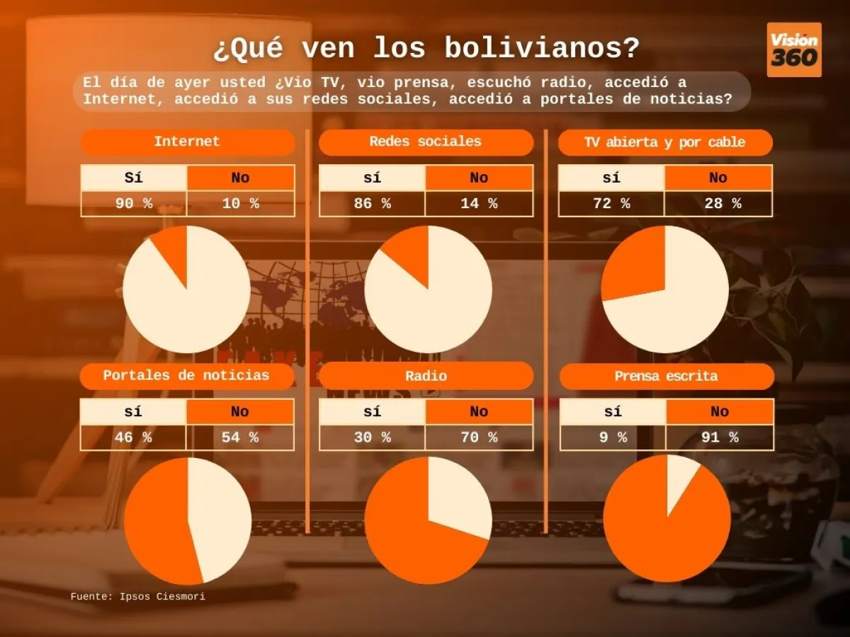 Una encuesta de Ipsos Ciesmori, contenida en su informe Radiografía de la Realidad Boliviana, buscó conocer qué miran, escuchan y leen los bolivianos. Los resultados se encuentran en el documento Navegando el Nuevo Contexto Económico de la empresa de investigación de mercados e insights y que se presentó el miércoles.