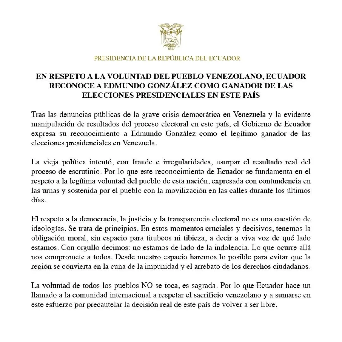 “En respeto a la voluntad del pueblo venezolano, Ecuador reconoce a Edmundo González como ganador de las elecciones presidenciales en ese país”, dice un comunicado de la Presidencia de la República del Ecuador.