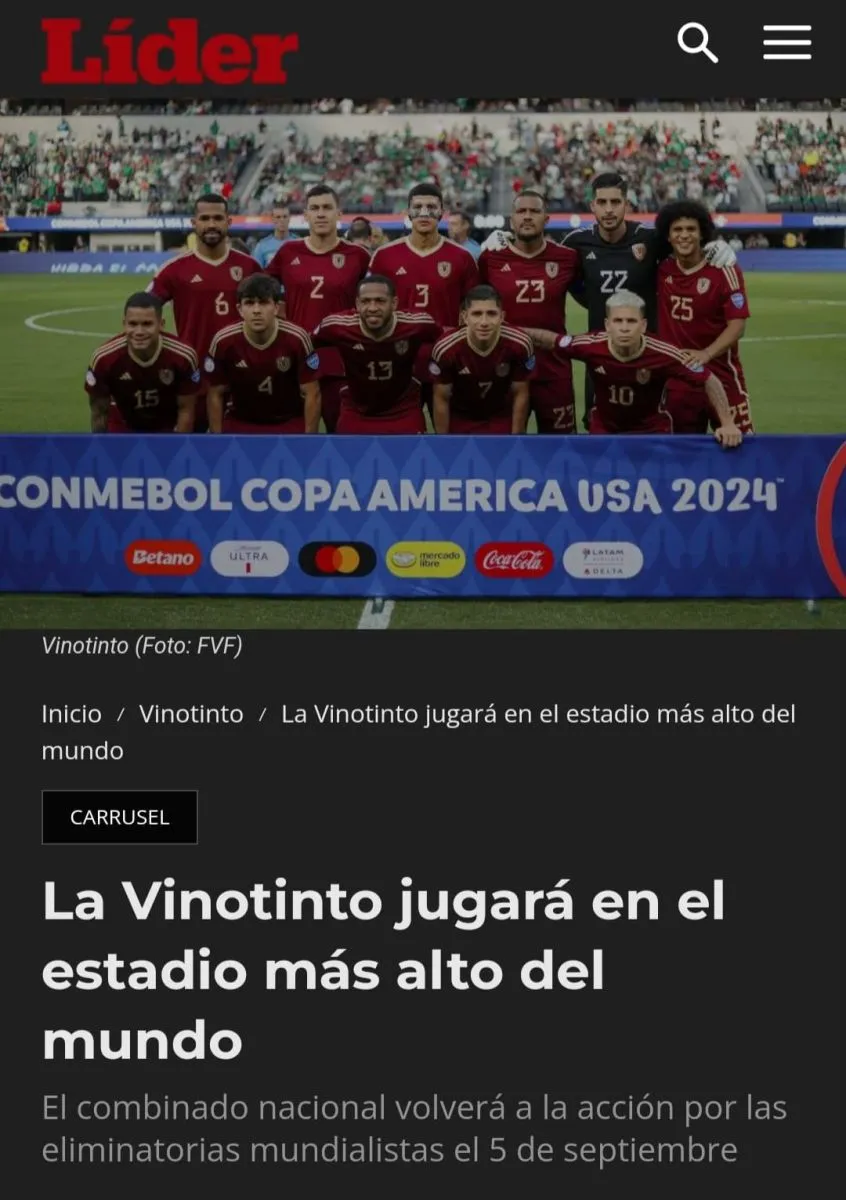 El portal Líder en Deportes destacó que “La Vinotinto jugará en el estadio más alto del mundo”.