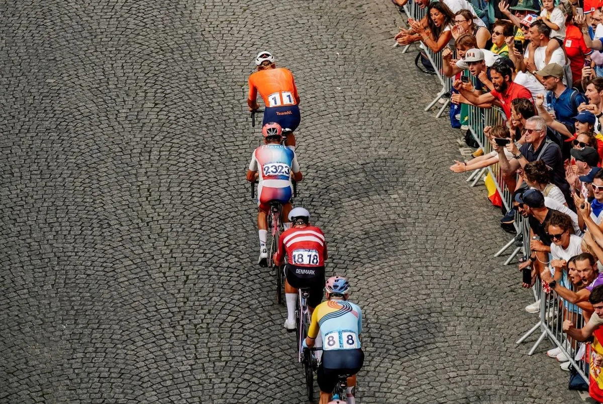 Cuatro ciclistas pasan por un tramo con varios aficionados. Foto: París 2024.