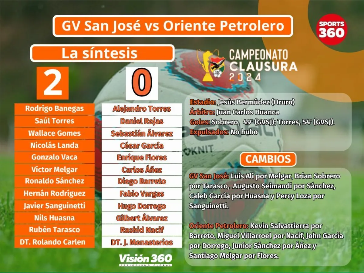 GV San José acabó con la racha de cuatro victorias consecutivas de Oriente Petrolero, tras ganarle por 2 a 0 en el partido con el que arrancó la novena jornada del torneo Clausura, que se jugó en la tarde de este sábado en el estadio Jesús Bermúdez de Oruro.