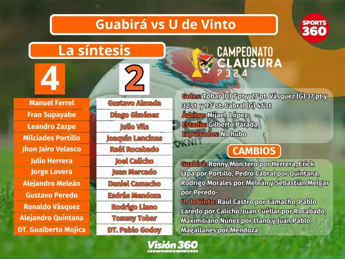 La insistencia de Guabirá tuvo su premio en el minuto 32 del segundo tiempo con otro remate de Vásquez, a la izquierda de Almada que pese a la estirada no pudo desviar el balón.
