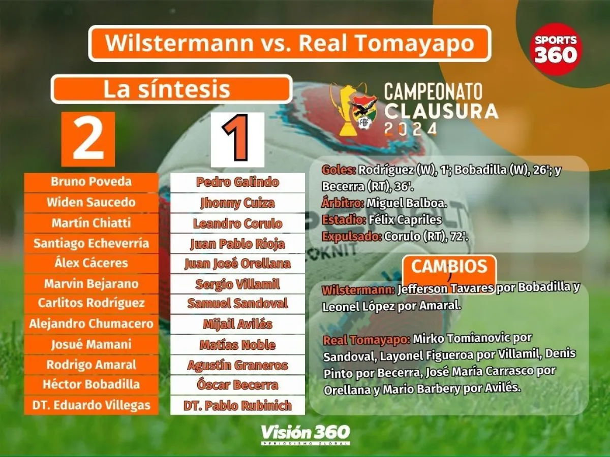 Wilstermann se impuso por 2-1 y le quitó el invicto de cuatro partidos sin perder a Real Tomayapo en el estadio Félix Capriles de Cochabamba, en el último cotejo de la jornada dominical en el marco de la novena jornada del torneo Clausura.