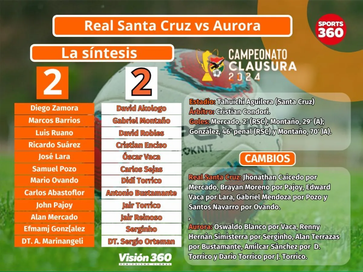 Real Santa Cruz no encuentra el rumbo en el torneo Clausura de la División Profesional. En la tarde de este lunes solo pudo empatar con Aurora (2-2), partido de la jornada 9, que se jugó en el estadio Tahuichi Aguilera de Santa Cruz de la Sierra, y ya son siete los partidos que no sabe de victorias.
