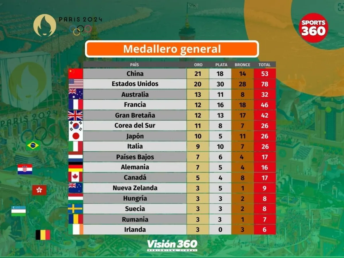 El equipo de China sumó este lunes dos oros más para situarse de nuevo al frente del medallero de los Juegos Olímpicos de París 2024, en el que suma 21 primeros puestos, 18 segundos y 14 terceros, para un total 53 metales.
