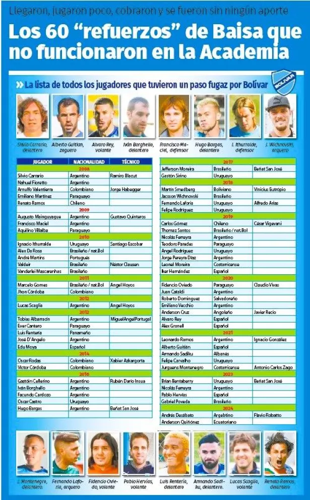 Gran parte de esa pérdida anual de la que informa su dirigencia a sus socios se debe a la cantidad de “refuerzos” que llegaron a Bolívar desde 2008.Según el recuento que realizó SPORTS 360 son 60 los futbolistas extranjeros que “no sonaron ni tronaron” en su paso por el club que erogó grandes sumas por sus transferencias.