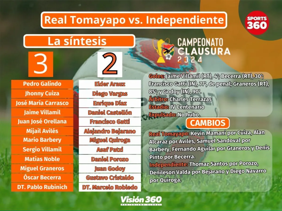 En un partidazo, sobre todo en el segundo tiempo, Real Tomayapo se impuso por 3-2 ante Independiente para ocupar el octavo lugar de la clasificación, este miércoles en el marco de la décima fecha del torneo Clausura.