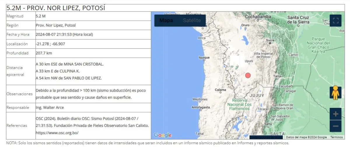 “El día 07 de agosto de 2024 a horas 21:31:53 (local), la Red Sismológica del Observatorio San Calixto (RS – OSC), registró un evento de magnitud 5.2 M, a una profundidad hipocentral de 207.7 km (sismo intermedio)”, establece el reporte del observatorio.