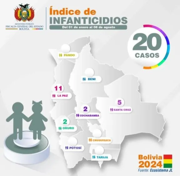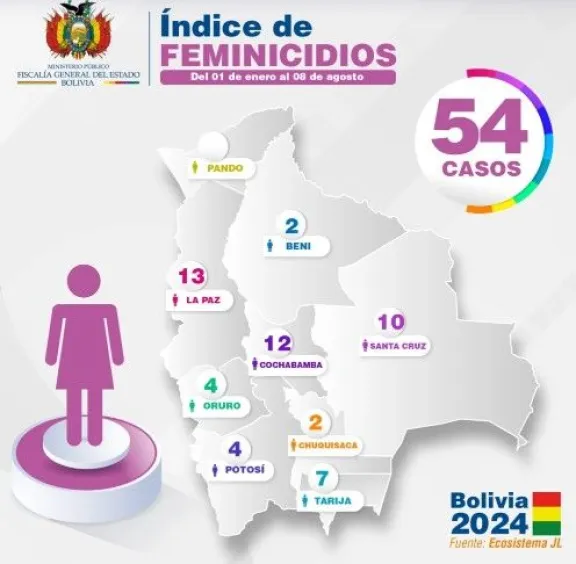 Indicó que en La Paz se reportaron 13 feminicidios, seguida por Cochabamba con 12. En el caso de los infanticidios, dijo que La Paz también encabeza la lista con 11 hechos, seguida por Santa Cruz con cinco.