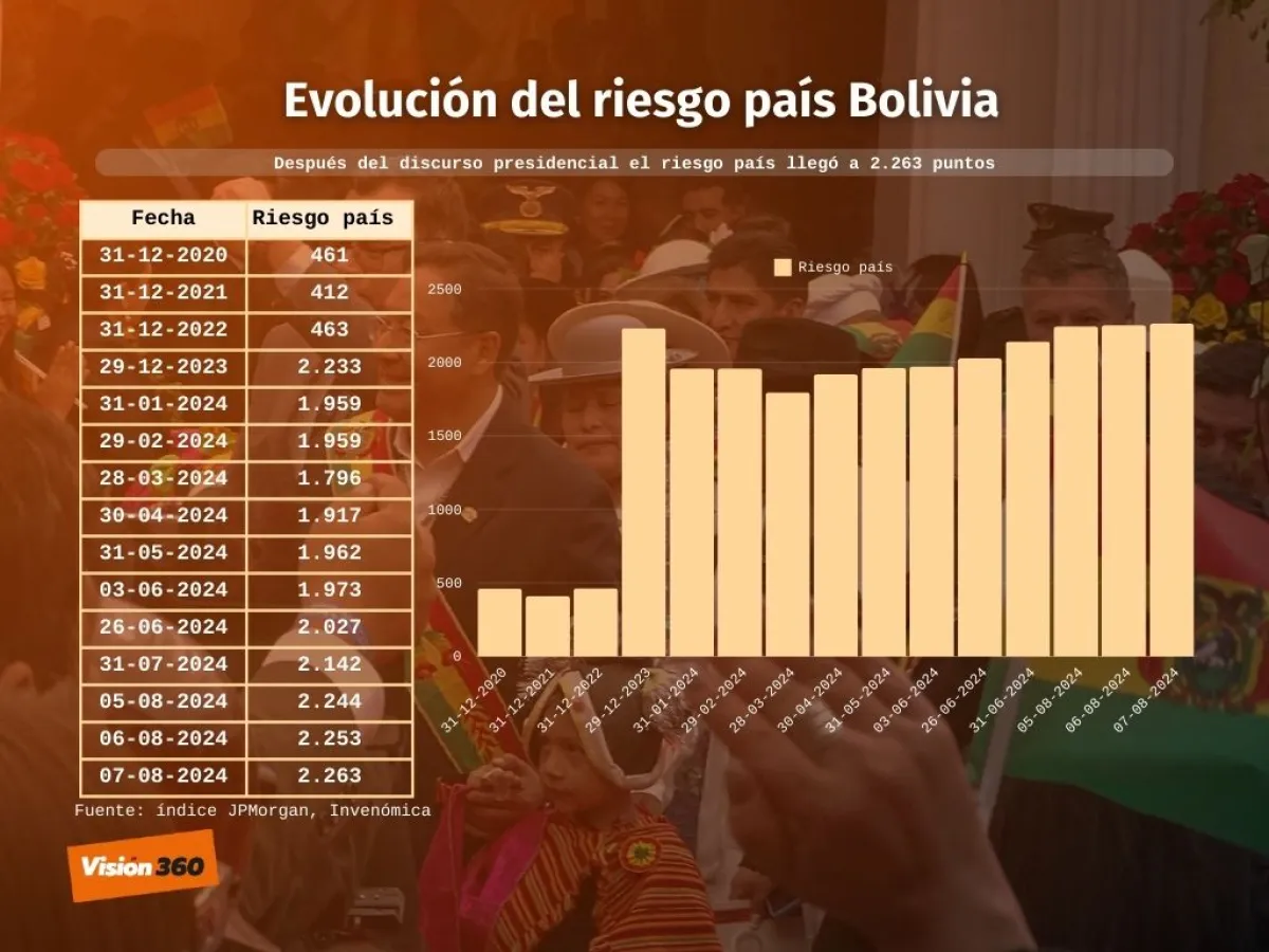 El día de la toma militar de la Plaza Murillo, el 26 de junio, el índice de riesgo país se había disparado a 2.027 puntos, el 31 de julio estaba en 2.142, el 5 de agosto se situó en 2.244 puntos, el 6 de agosto, en 2.253 puntos y el 7 de agosto llegó a 2.263 puntos.