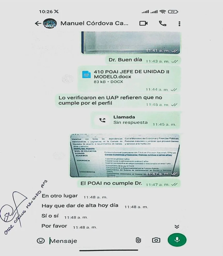 Para confirmar su versión y descargar toda responsabilidad, Mendoza también presentó capturas de pantalla de las conversaciones de WhatsApp que mantuvo con Córdova. En estas se observa que Mendoza le informa al Secretario General que Salazar no cumplía con el perfil profesional para ser jefe de unidad.