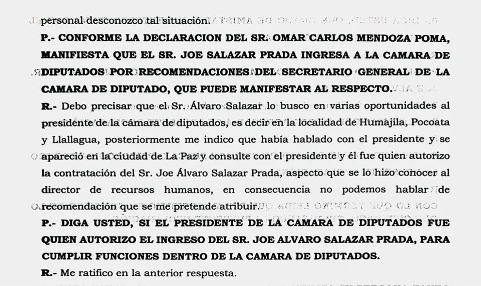 El exjefe de RRHH respondió que era necesario aclarar que Salazar ingresó a trabajar a la Cámara de Diputados “por recomendación del Secretario General de la Cámara de Diputados (abogado) Manuel Córdova, el mismo indica de manera textual que el señor Salazar es soldado del presidente de la Cámara de Diputados (Huaytari)”, aseveró Mendoza en parte de su respuesta.