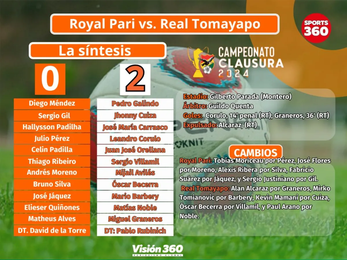 Real Tomayapo dio la nota en el inicio de la undécima jornada del Torneo Clausura al derrotar este sábado a Royal Pari 0-2 en el estadio Gilberto Parada de Montero.