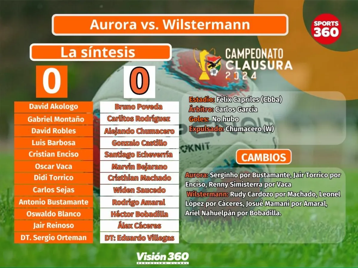 Aurora y Wilstermann empataron sin goles este domingo en el estadio Félix Capriles de Cochabamba, por la undécima jornada del Torneo Clausura de la División Profesional. El resultado que no les sirve mucho en sus aspiraciones de escalar en las posiciones.