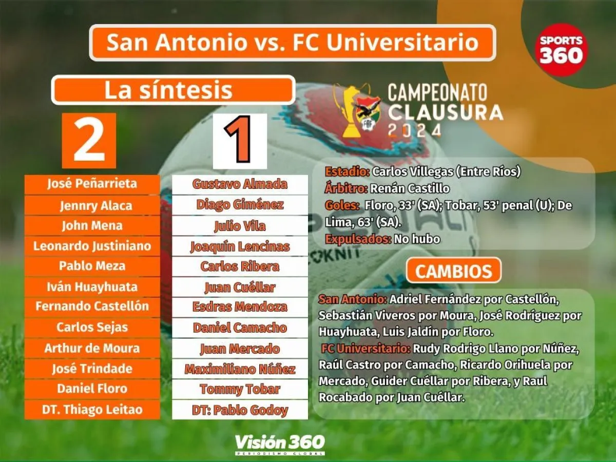 San Antonio volvió a la ruta del triunfo con el 2-1 a su favor frente a FC Universitario este lunes en el estadio Carlos Villegas de Entre Ríos, por la undécima jornada del Torneo Clausura de la División Profesional.