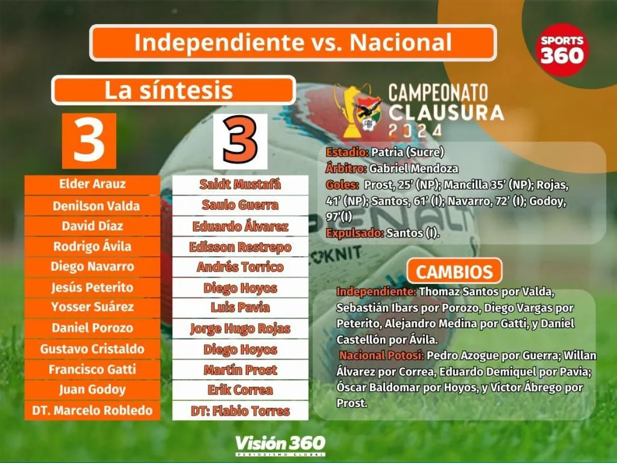 Nacional Potosí le dio un baile a Independiente con un inapelable 0-3 en el primer tiempo, pero en el segundo fue obligado a retroceder líneas y su cómoda victoria se transformó en un empate 3-3, este lunes en el estadio Patria de Sucre por la undécima jornada del Torneo Clausura de la División Profesional.