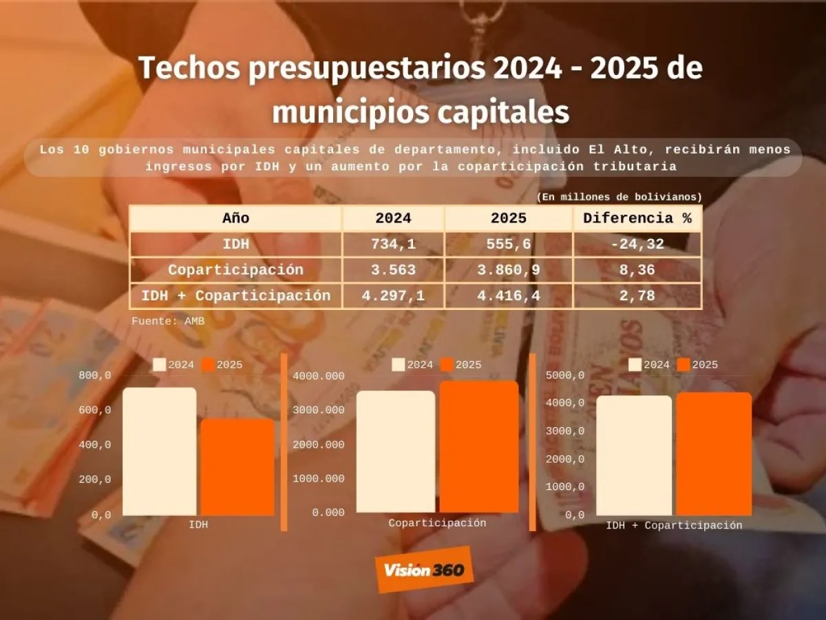 La coparticipación crecerá en 8,36%. En total los recursos de IDH y coparticipación de los municipios capitales subirán de 4.297,1 a 4.416,4 millones de bolivianos en 2025, lo cual representa un incremento de 2,78%.