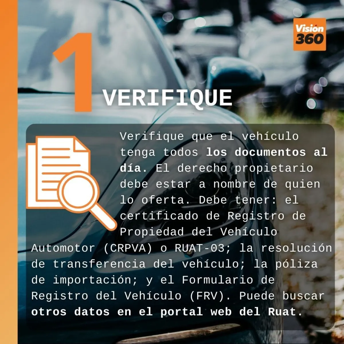 Si es que el vendedor no fuera el propietario debe portar un poder vigente que lo faculte para vender el vehículo y realizar los trámites. Puede comprobar si el motorizado  tiene deudas tributarias, gravámenes y otros datos en el portal web del Registro Único para la Administración Tributaria (Ruat).