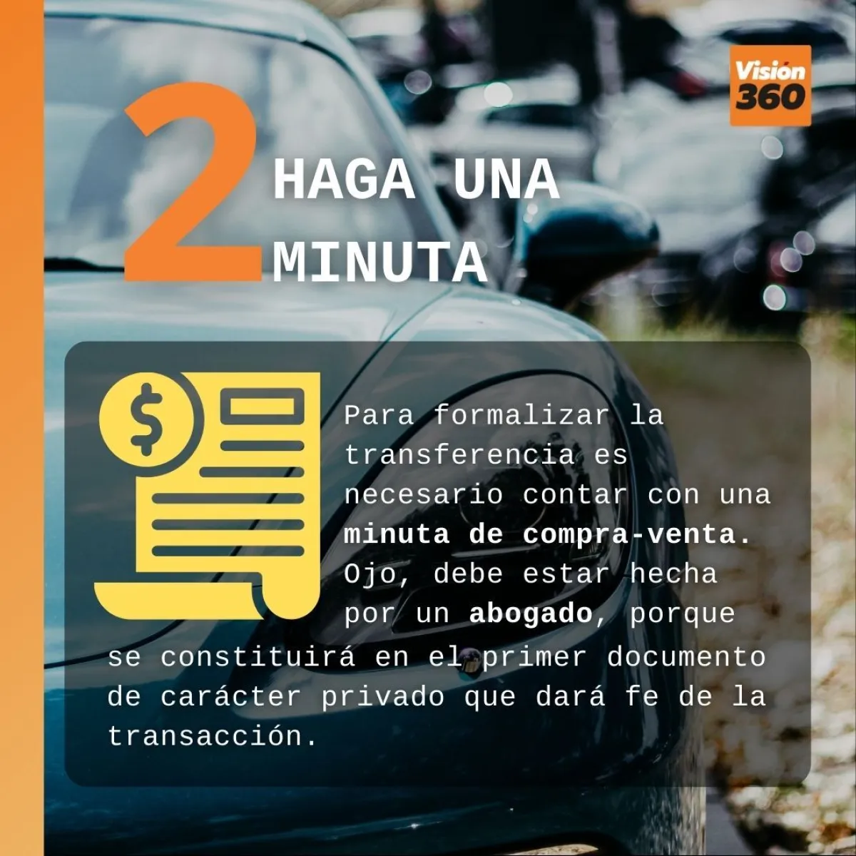 Para formalizar la transferencia es necesario contar con una minuta de compra-venta. Ojo, debe estar hecha por un abogado, porque se constituirá en el primer documento de carácter privado que dará fe de la transacción.