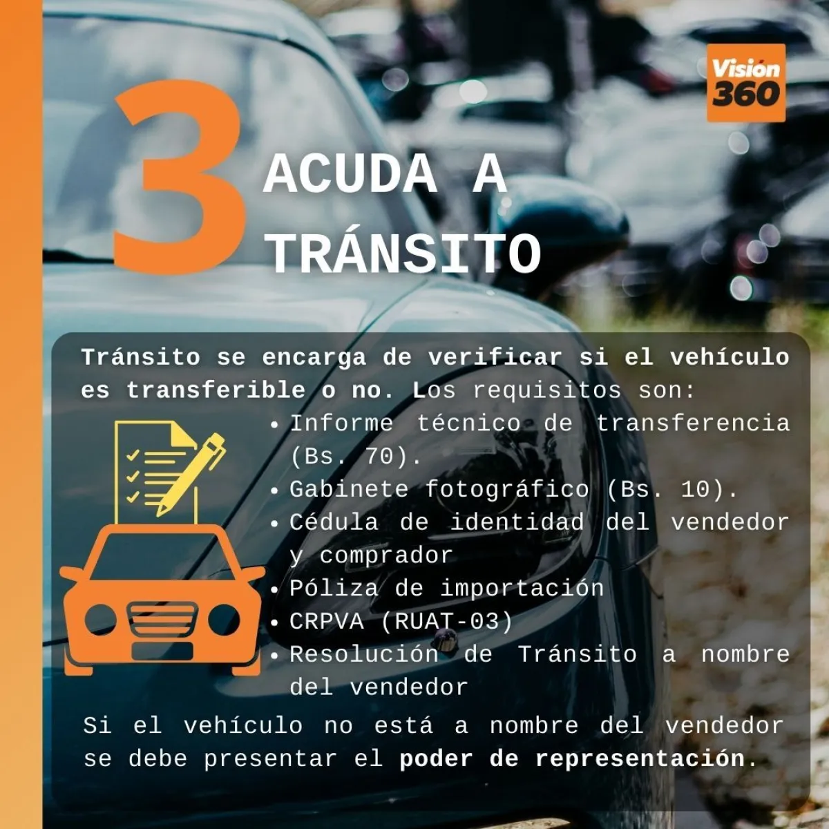 Según su portal web, los requisitos son: informe técnico de transferencia (70 bolivianos), gabinete fotográfico (10 bolivianos), cédula de identidad del vendedor y comprador, póliza de importación, CRPVA (RUAT-03) y la resolución de Tránsito a nombre del vendedor.