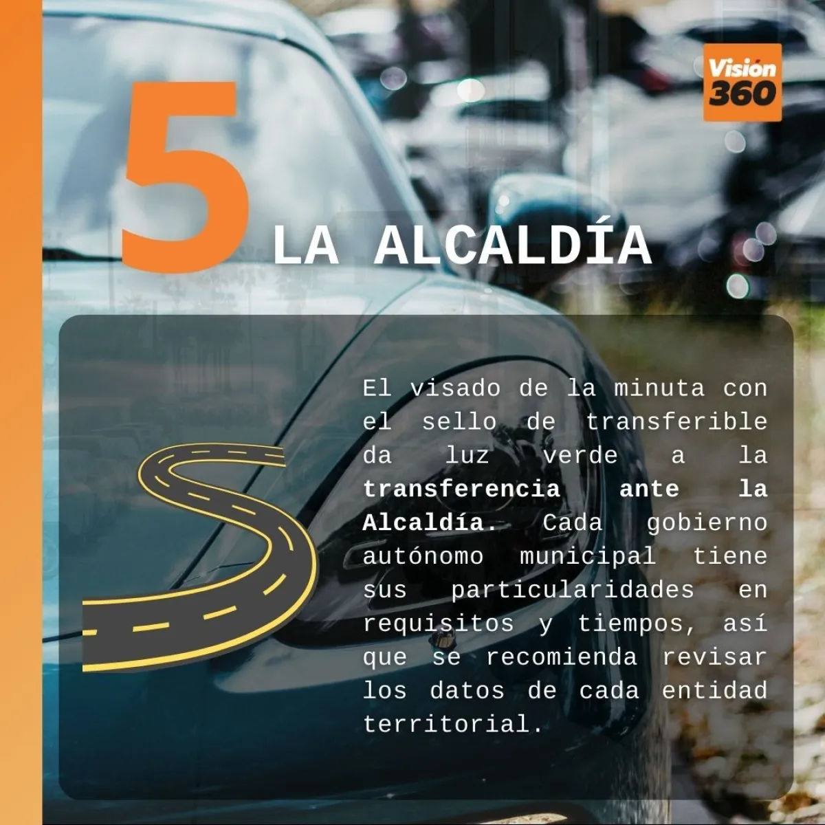 Para dar curso al trámite, la minuta de compra-venta y los documentos del vehículo deben ser visados por Tránsito de la Policía Boliviana. Esta entidad se encarga de verificar si el vehículo es transferible o no.