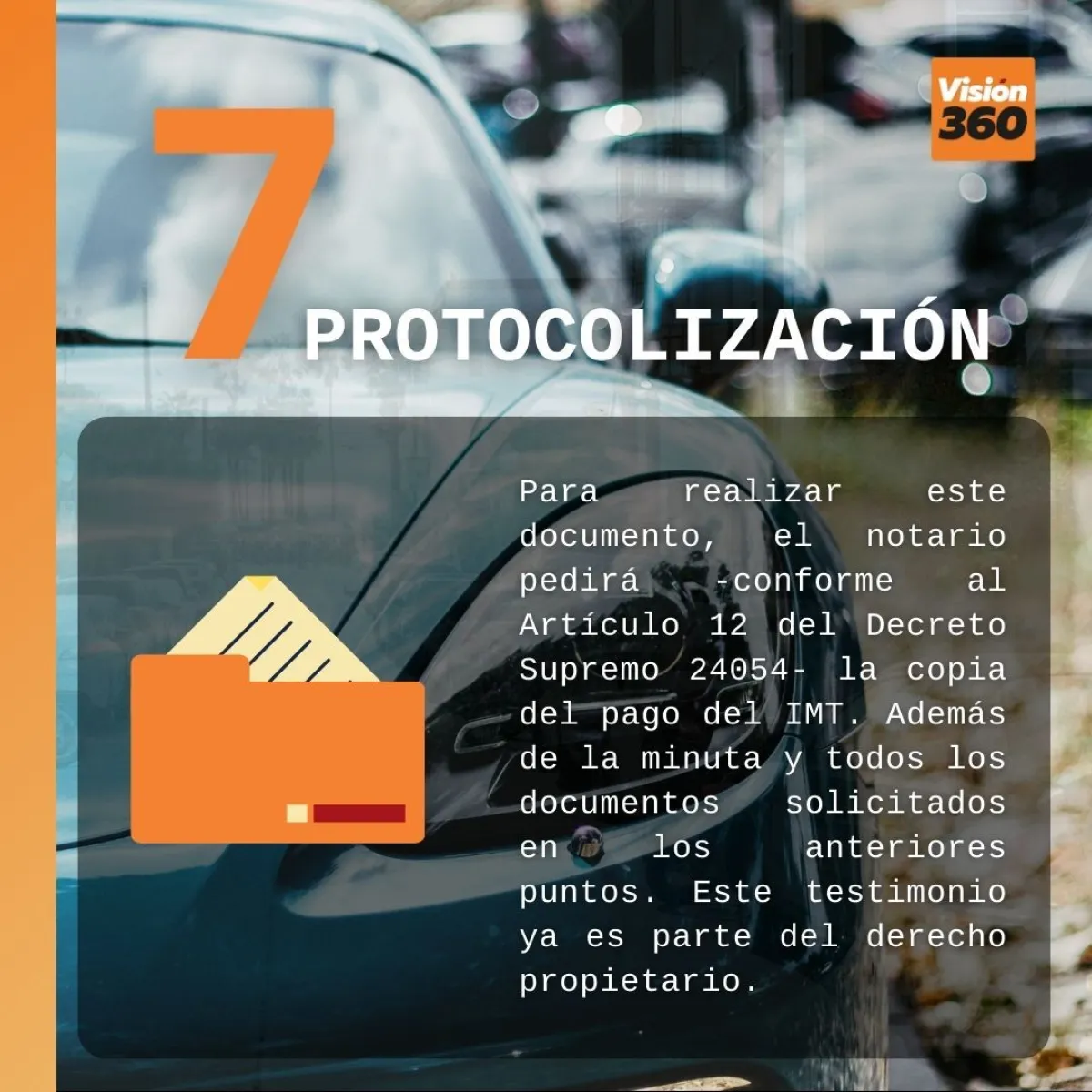 Con el pago del IMT y los anteriores requisitos vendedor y comprador deben apersonarse a una notaría para protocolizar la transferencia del vehículo. El Testimonio cuesta, de acuerdo a la tabla de aranceles de la Dirección del Notariado Plurinacional (Dirnoplu), 180 bolivianos.