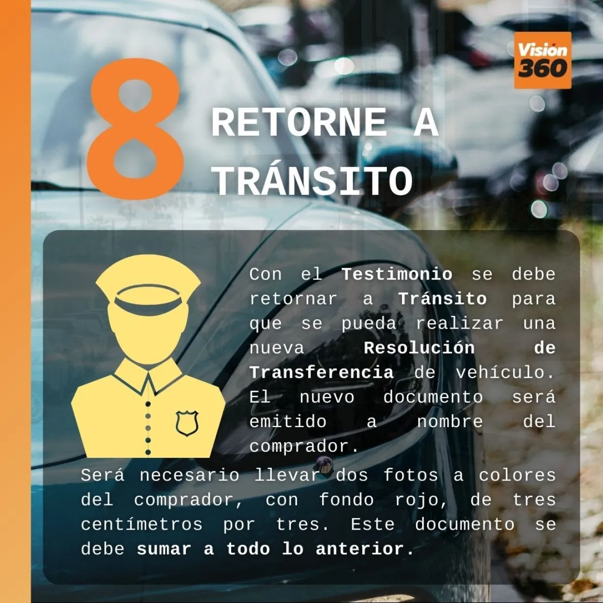 Con el Testimonio se debe retornar a Tránsito para que se pueda realizar una nueva Resolución de Transferencia de vehículo. El nuevo documento será emitido a nombre del comprador. Será necesario llevar dos fotos a colores del comprador, con fondo rojo, de tres centímetros por tres. Este documento se debe sumar a todo lo anterior.