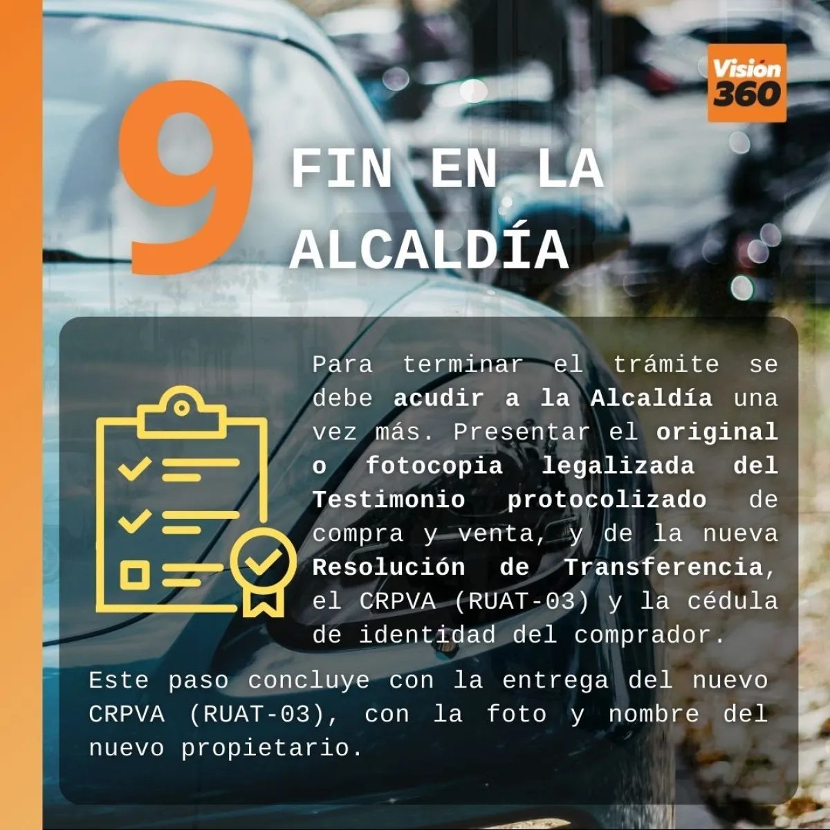 Para terminar el trámite se debe acudir a la Alcaldía una vez más. Se debe presentar: el original o fotocopia legalizada del Testimonio protocolizado de compra y venta, además del original y fotocopia de la nueva Resolución de Transferencia, el CRPVA (RUAT-03) y la cédula de identidad del comprador.