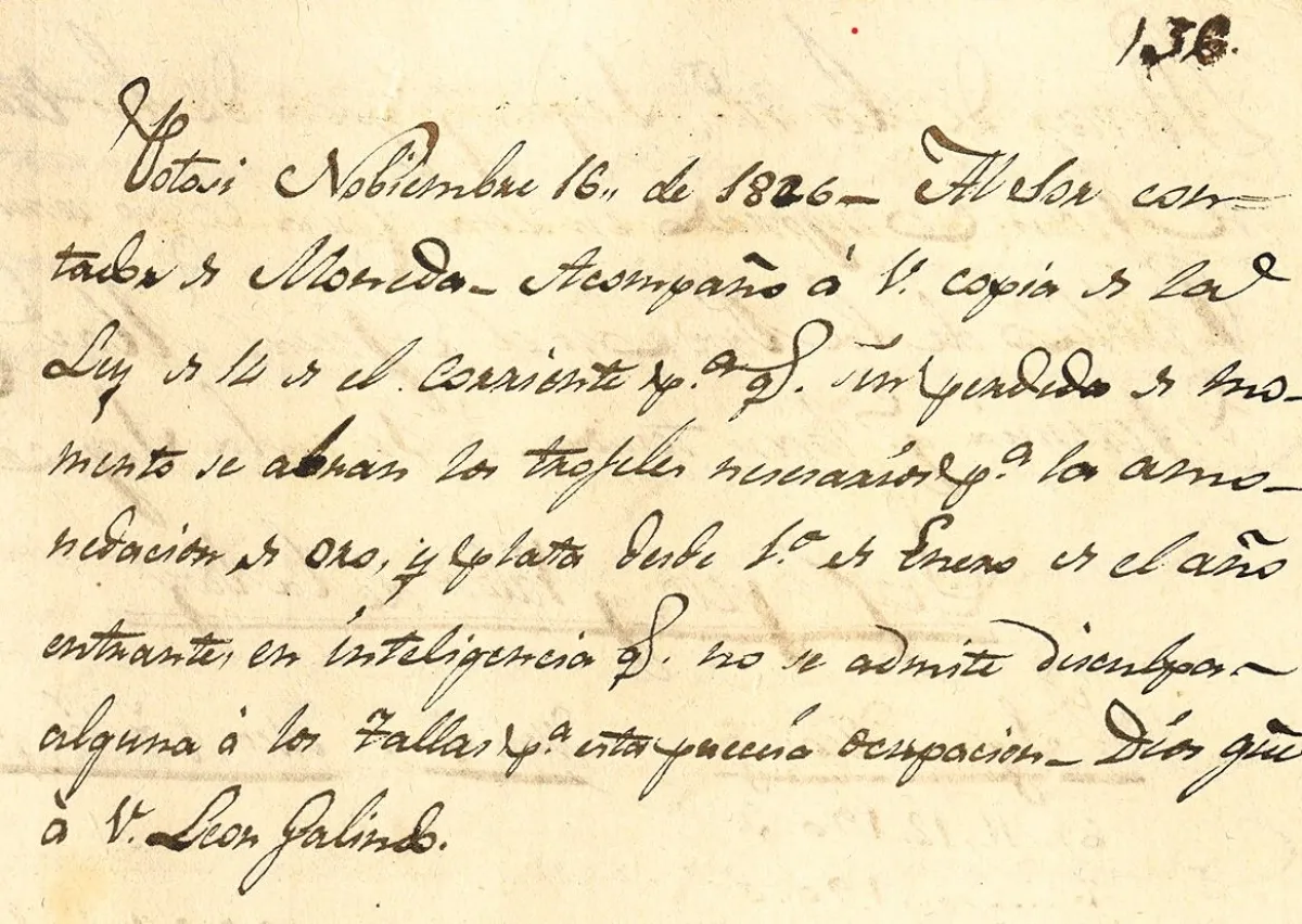 En la Casa de Moneda, con personal mayoritariamente realista, no había demasiado interés en hacer el cambio y en 1826 seguía acuñándose moneda española, pero con el año anterior. El 9 de marzo, el contador, José Eustaquio Eguívar, le informaba al ministro Facundo Infante que “en el inventario que se practicó de esta oficina se echan de menos todas las órdenes reservadas de esta Casa, tanto en orden a la ley de moneda, como sobre la formación de cuentas” (CNM-AHP CdM 59. f 75v.).
