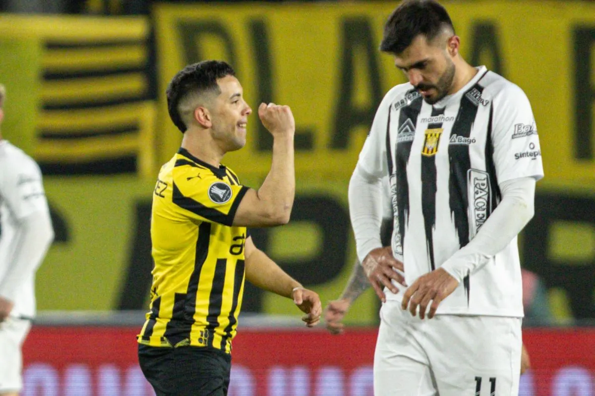 Leonardo Fernández festeja el primero de Peñarol; lo sufre Enrique Triverio. Foto: APG