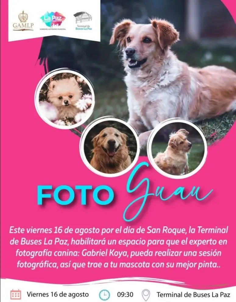 La Terminal de Buses La Paz celebrará San Roque este viernes con una sesión de fotos denominada “Foto Guau” a cargo del fotógrafo Gabriel Koya. “El único requisito es traer a tu mascota con su mejor pinta”, dice una nota de la agencia municipal de noticias.
