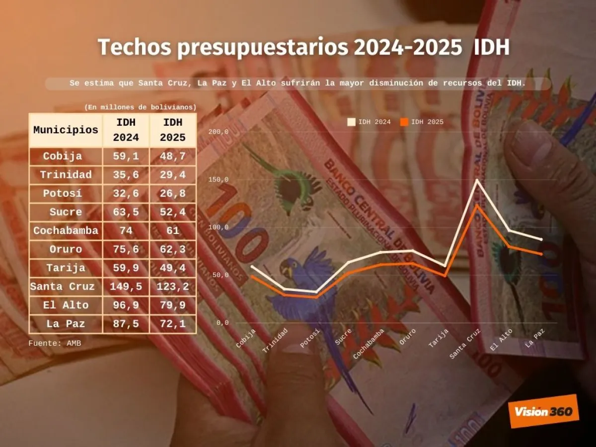 Los techos presupuestarios del IDH para los 10 municipios capitales y El Alto, bajarán de 734,1 a 605,2 millones de bolivianos en 2025, es decir en un 17,56%, según la AMB.