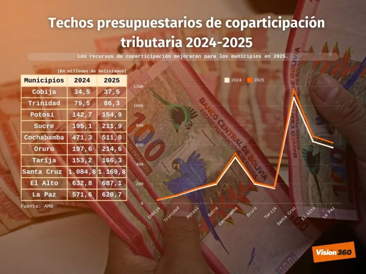 En el caso de la coparticipación tributaria, los datos de la AMB revelan que, en 2024, estos recursos llegaron a un valor de 3.694 millones de bolivianos y, para 2025, los techos programados suman 3.861 millones de bolivianos, es decir un aumento de 4,52%.