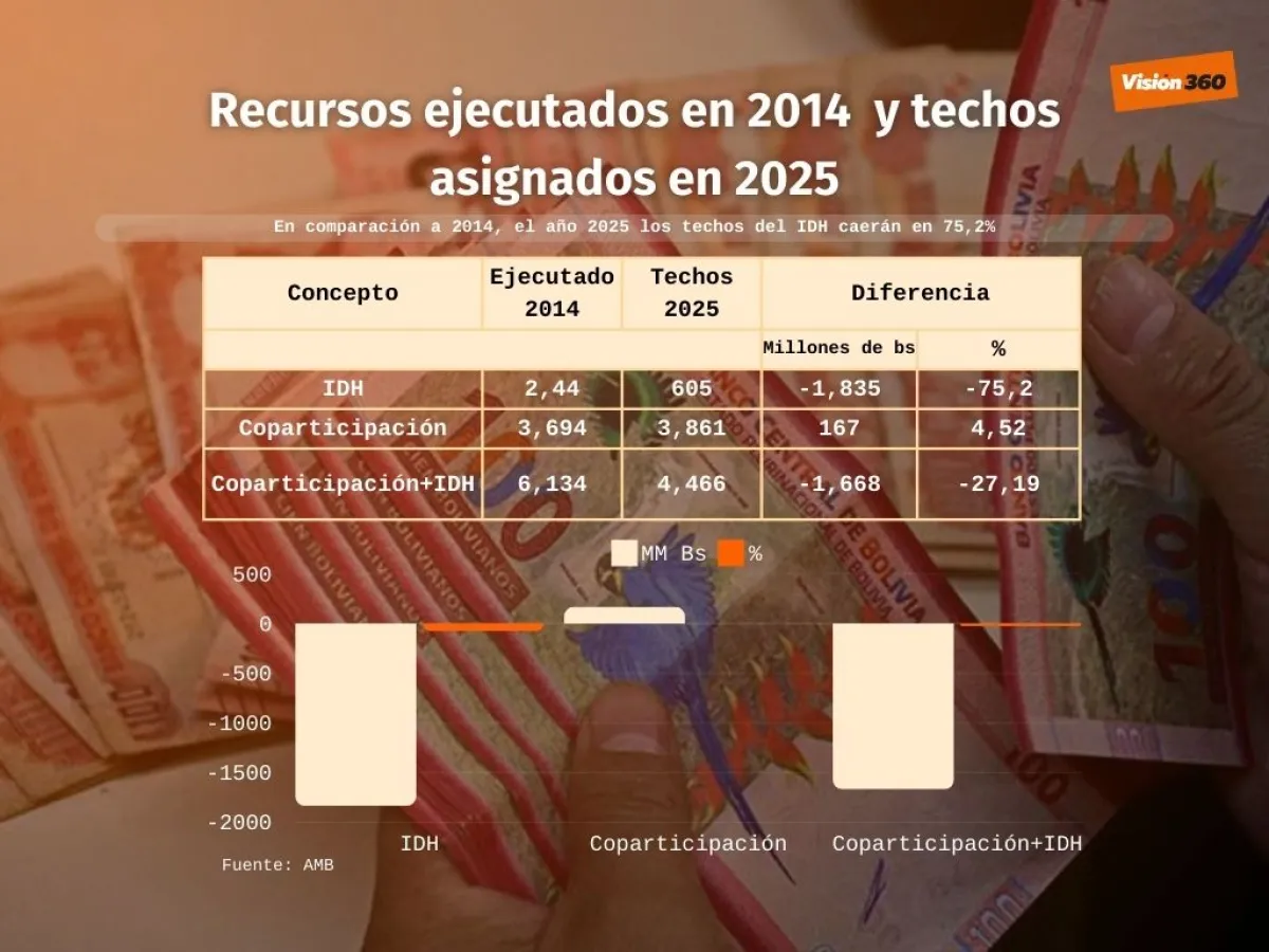 Las proyecciones realizadas por la AMB revelan que los ingresos ejecutados del IDH por los municipios, en 2014, alcanzaron un valor de 2.440 millones de bolivianos, pero que los techos para 2025 bajarán 605,2 millones de bolivianos. Esto representa una caída histórica del 75,2% o, en número redondos, un descenso de 1.835 millones de bolivianos en 11 años.