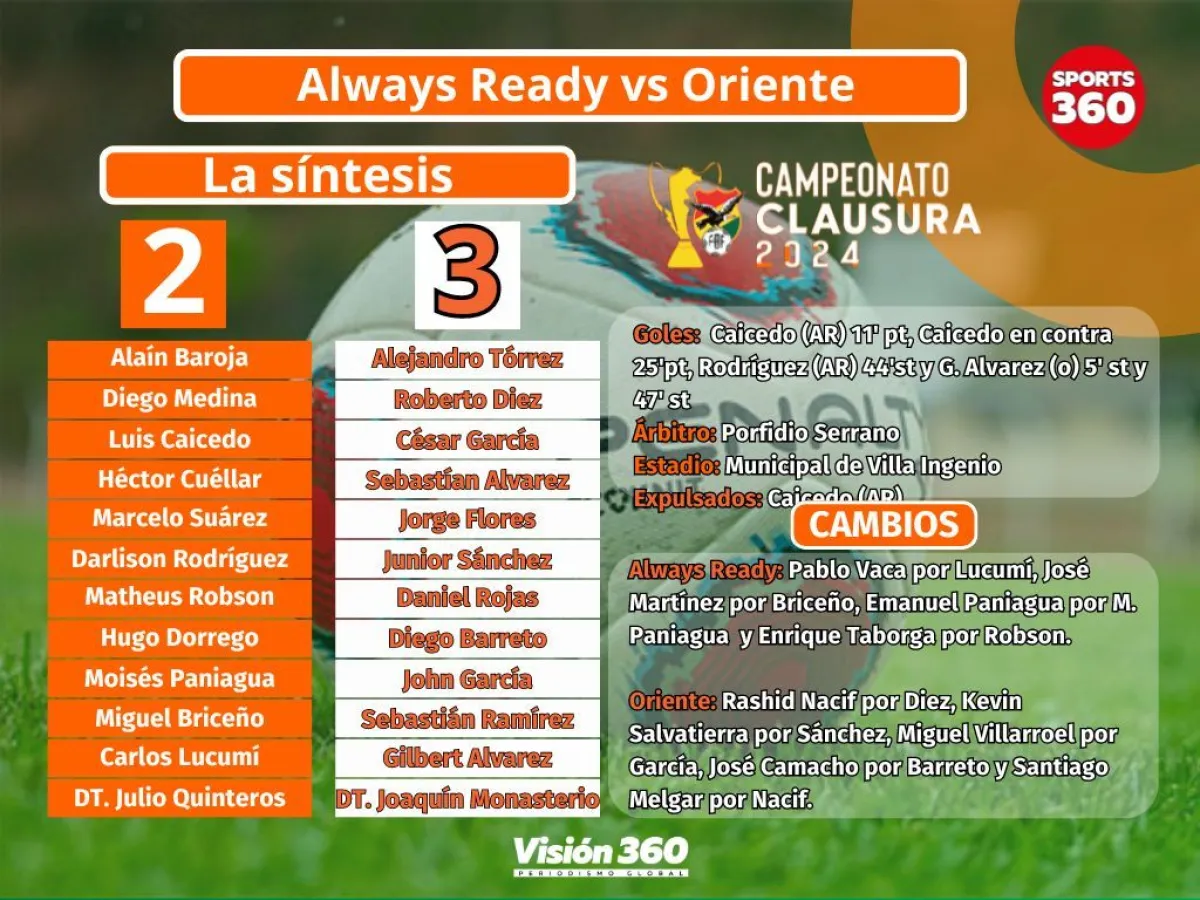 Oriente Petrolero consiguió esta noche su primer triunfo de la historia en Villa Ingenio al derrotar a Always Ready por 3-2, en partido que marcó el inicio de la fecha 12 del torneo Clausura de la División Profesional.