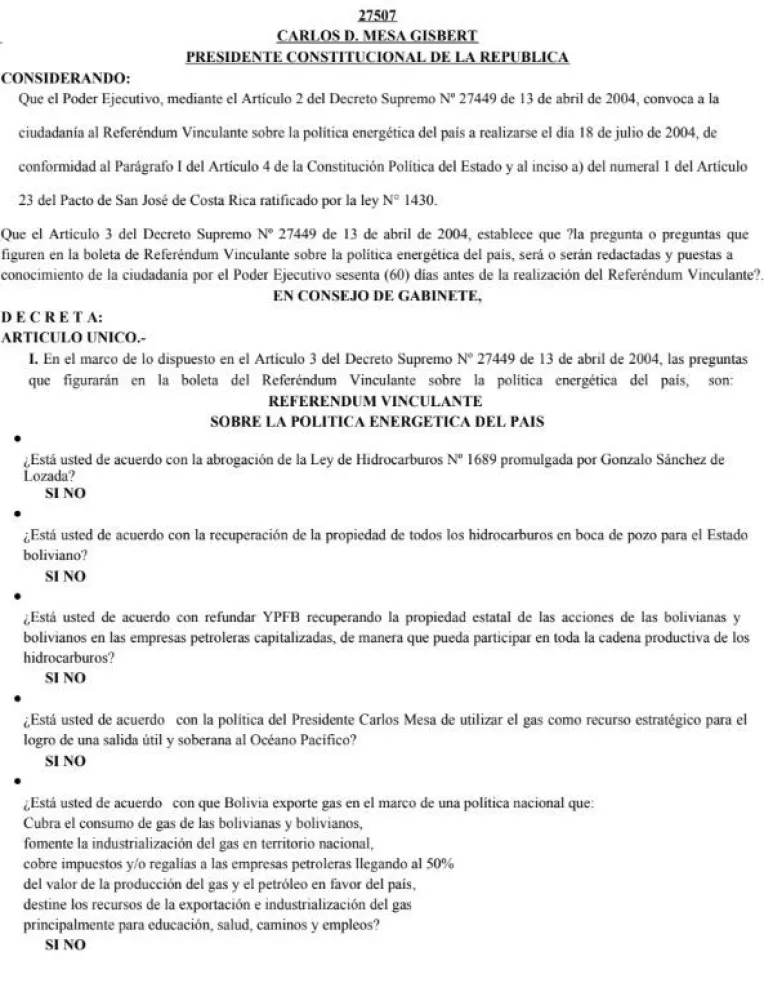 “Respuesta a los diputados de CC: su jefe, Carlos Mesa convocó a referendo por decreto en abril de 2024. No más comentarios”, aseguró el ministro en su cuenta de la red X, en la que adjuntó el Decreto Supremo 27507, firmado por el consejo del gabinete del expresidente y que incluía cinco preguntas sobre el gas.