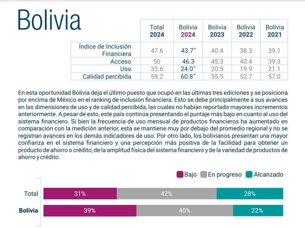 Desde 2021, el país ha pasado de 39 a 43.7 puntos, lo cual destaca una tendencia positiva en su nivel de inclusión financiera. Además, el porcentaje de la población boliviana con un nivel de inclusión financiera alcanzado (avanzado) aumentó del 14% en 2023 al 22%.