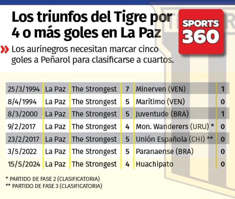 En 30 participaciones en Copa Libertadores de América, incluida esta de 2024, que se encuentra en pleno desarrollo, The Strongest jugando en el estadio Hernando Siles ha ganado siete partidos por cuatro o más goles de diferencia, la última vez hace poco más de tres meses —15 de mayo— cuando goleó a Huachipato de Chile por 4 a 0 en fase de grupos.
