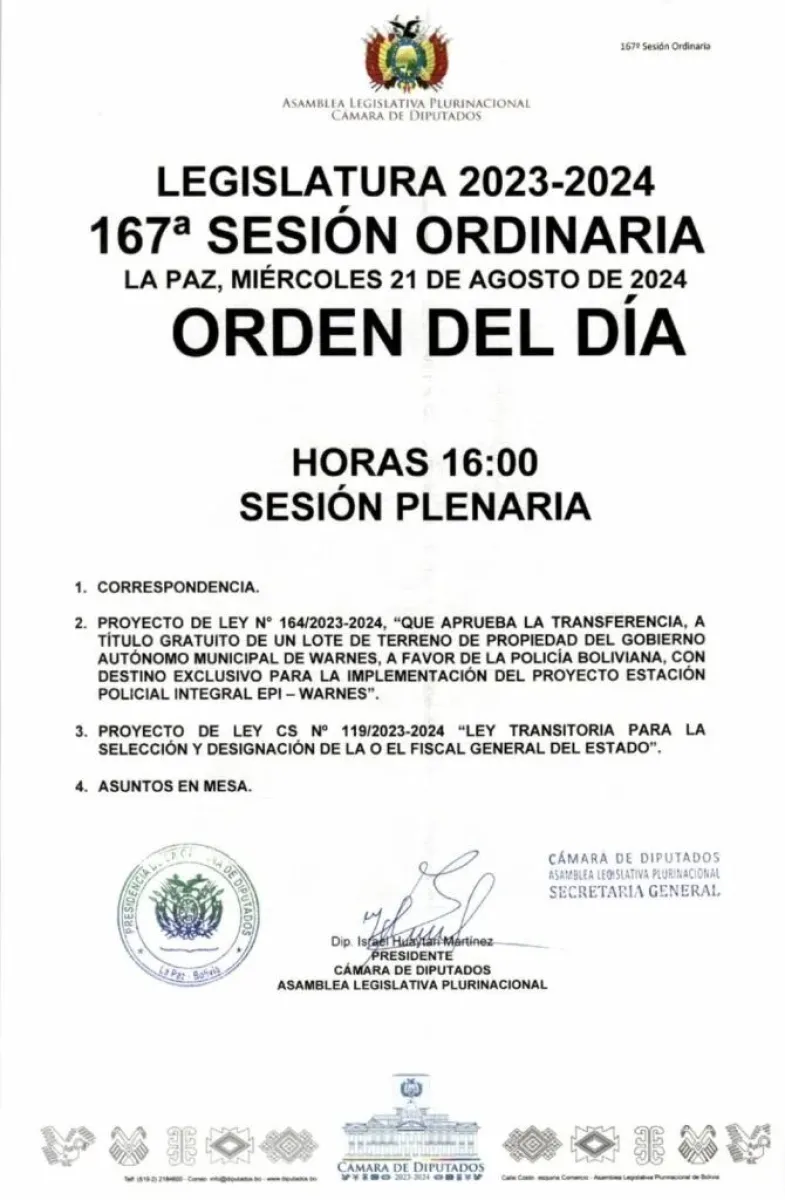 La sesión camaral está programada para las 16.00 y tiene dos temas en agenda, al margen de correspondencia y asuntos varios. Estos son proyecto de Ley N° 164/2023-2024, que aprueba la transferencia, a título gratuito de un lote de terreno de propiedad del gobierno autónomo municipal de Warnes, a favor de la Policía Boliviana, con destino exclusivo para la implementación del proyecto estación policial integral EPI – Warnes” y el proyecto de Ley CS N° 119/2023-2024 que es la Ley transitoria para la selección y designación de la o el Fiscal General del Estado.