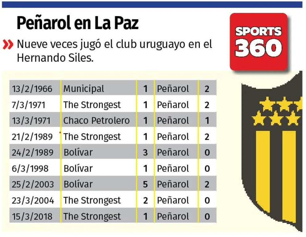 Entre 1966 y 1989, el “Carbonero”, así se conoce a Peñarol en su país, se presentó en La Paz en cuatro ocasiones y mantuvo un invicto que se tradujo en tres victorias y un empate.