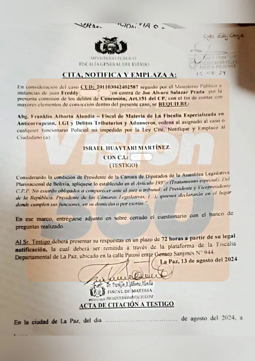 El documento al que Visión 360 tuvo acceso, menciona que el presidente de la Cámara de Diputados recibirá un sobre cerrado, con las preguntas relacionadas al caso por el delito de concusión, en el marco del “tratamiento especial” que señala el artículo 195 de la Constitución Política del Estado (CPE), para autoridades electas por voto, que las mismas “declararán en el lugar donde cumplen sus funciones, en su domicilio o por escrito”.