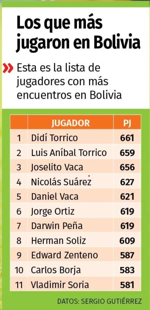 En el clásico frente a Wilstermann disputó su encuentro 661 y esta noche contra Royal Pari espera comenzar a sacar una mayor diferencia, más si se toma en cuenta que Torrico por el momento se encuentra jugando en Real Potosí, que tomará parte de la Copa Simón Bolívar.