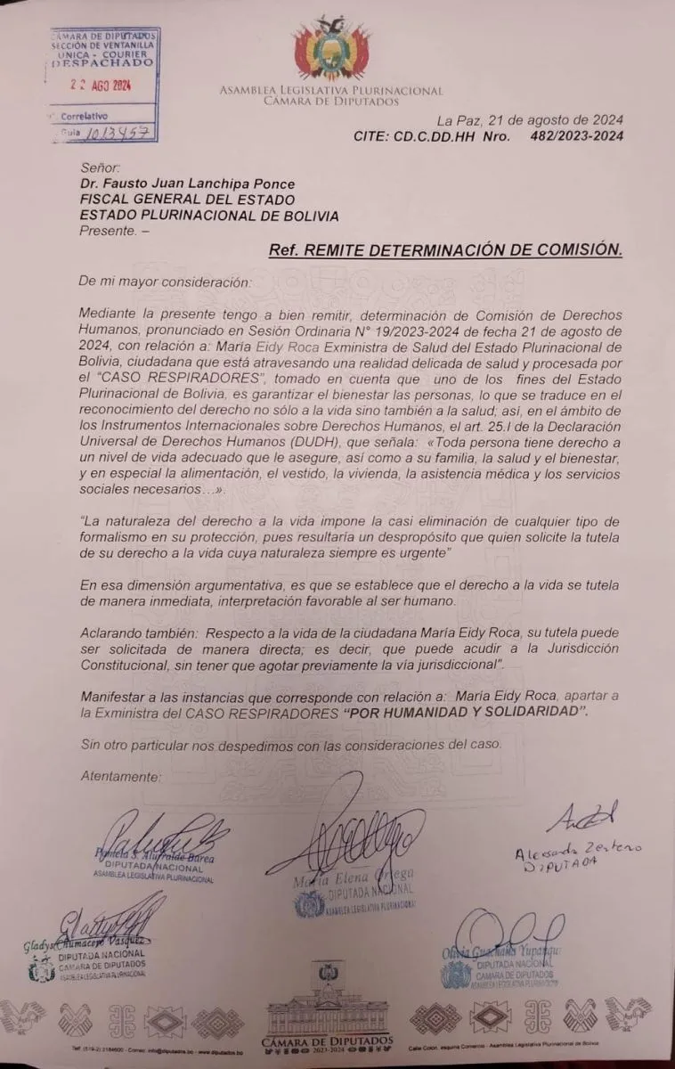 La Comisión de Derechos Humanos (DDHH) de la Cámara de Diputados envió ayer una carta al fiscal general del Estado, Juan Lanchipa, en la que pide que la exministra de Salud, Eidy Roca, sea apartada del caso Respiradores, en atención a su estado de salud.