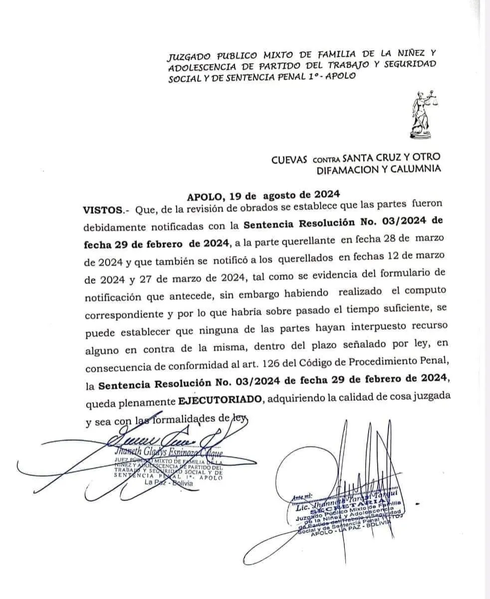 “La sentencia resolución Nro 03/2024 queda plenamente ejecutoriado adquiriendo la calidad de cosa juzgada y sea con las formalidades de ley”, señala el documento judicial, firmado el pasado 19 de agosto, y publicado por la Red de Comunicadores Indígenas.