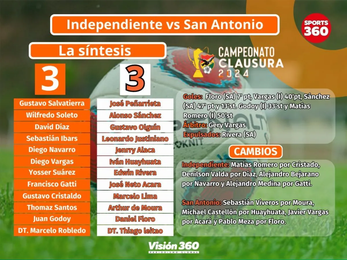 San Antonio de Bulo Bulo se durmió en la parte final de un partido emocionante y se hizo empatar 3-3 con Independiente, cuando tenía dos goles de ventaja en gran parte del compromiso que se jugó en el estadio Patria de la Capital.