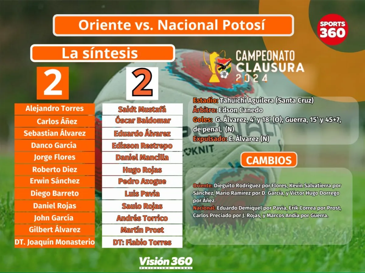 Oriente Petrolero y Nacional Potosí protagonizaron un vibrante empate a dos goles por bando este domingo en el estadio Tahuichi Aguilera de Santa Cruz, por la decimotercera jornada del Torneo Clausura de la División Profesional.